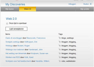 Hoewel aanvankelijk nog wat moeizaam, heb ik erg veel geleerd van het werken aan een weblog. Ik vond het ook leuk om er mijn ding van te maken. Ook liep nik trouw elke keer al mijn RSS berichtjes na. Ik ben van plan daar ook in de toekomst nog wat mee te gaan doen, maar dan ga ik wel meer selecteren. Nu waren het vooral de voortgangsberichten van collega's die ik bijhield. Flickr vond ik leuk en bruikbaar. Ik zet er nu foto's op die ik maak voor de bibliotheek. Dan kan Boekenparel ze daar weer ophalen voor de website. Plaatjes bewerken was een leuke pauze in het geheel. Kun je ook leuk mee scoren bij je kinderen ;) Voor de bibliotheek wat minder bruikbaar.. Youtube vond ik ook leuk. Kun je ook heel bruikbare filmpjes mee maken voor op de bibliotheeksite. Mobiel internet vond ik vooral erg interessant. Een echte eyeopener. Ook leuk om te delen met mijn zoon, die zich erg aan het verdiepen is in de mogelijkheden van internet ter promotie van zijn band. LibraryThing vond ik erg leuk. ben ook nog steeds van plan om die verder te gaan gebruiken, maar de tijd ontbreekt me nog. heb intussen wel veel alternatieven gevonden om je lijstje bij te houden: via de Aquabrowser, Boekensalon en zelfs via onze eigen Bicat-catalogus. Ten slotte vandaag aangemeld bij bibliotheek20.ning met de bedoeling deze groep via rss te gaan volgen. Heb trouwens al mijn favoriete functionaliteiten bij elkaar staan op mij iGoogle pagina. Als ik daar de startpagina van maak, houd ik het misschien ook een beetje bij.